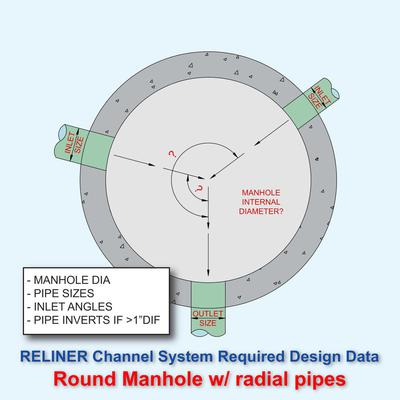 Contact RELINER for assistance in selecting the proper system components for your application.    Parts are selected based on the unique configuration of each manhole.   Required information includes the diameter of the manhole, angular location and size of each incoming pipe and the outlet, and any other special considerations that may apply such as variations in the inlet elevations of more than 1”, irregular shaped structures, or pipes that are not radial.   The attached sheet can be used to provide this information.    Emailed photos are also helpful.